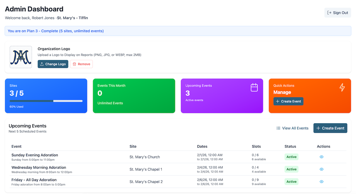 Say goodbye to notebooks or spreadsheets — AdorationHub makes it easy to set up events and time-slots with just a few clicks of the mouse.