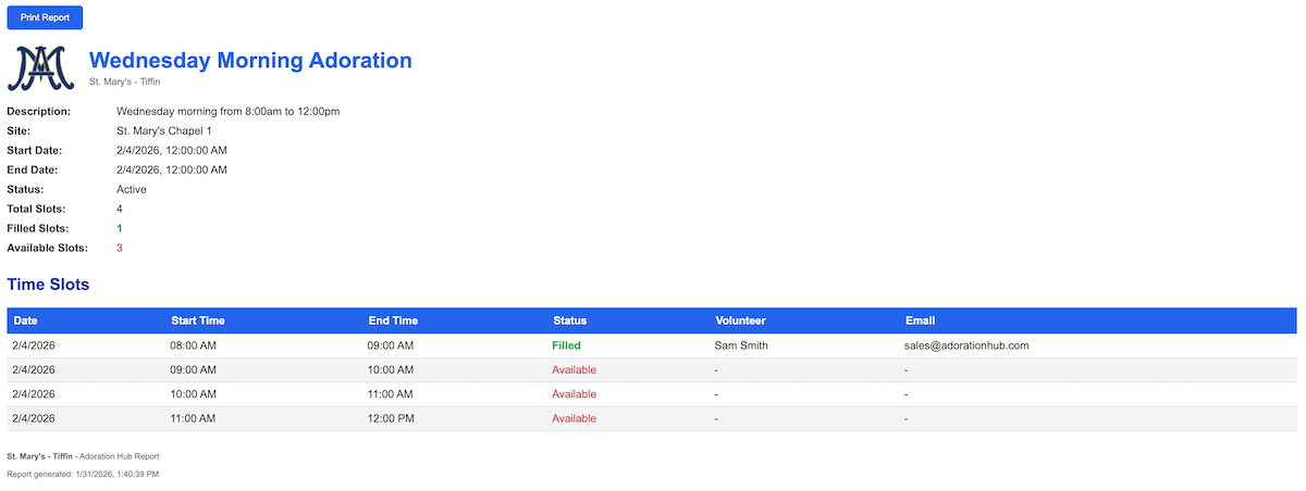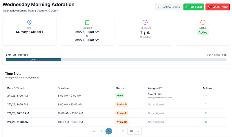 Coordinators have complete control over adoration scheduling from a single, intuitive dashboard. Create, edit, or remove events and time slots with just a few clicks, assign volunteers to specific hours, and manage last-minute substitutions without the usual scramble. Full access to volunteer and event reports—with viewing and printing capabilities—keeps you informed and organized. Everything you need to maintain seamless adoration coverage is at your fingertips.