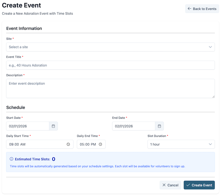 Say goodbye to notebooks or spreadsheets — AdorationHub makes it easy to set up events and time-slots with just a few clicks of the mouse.